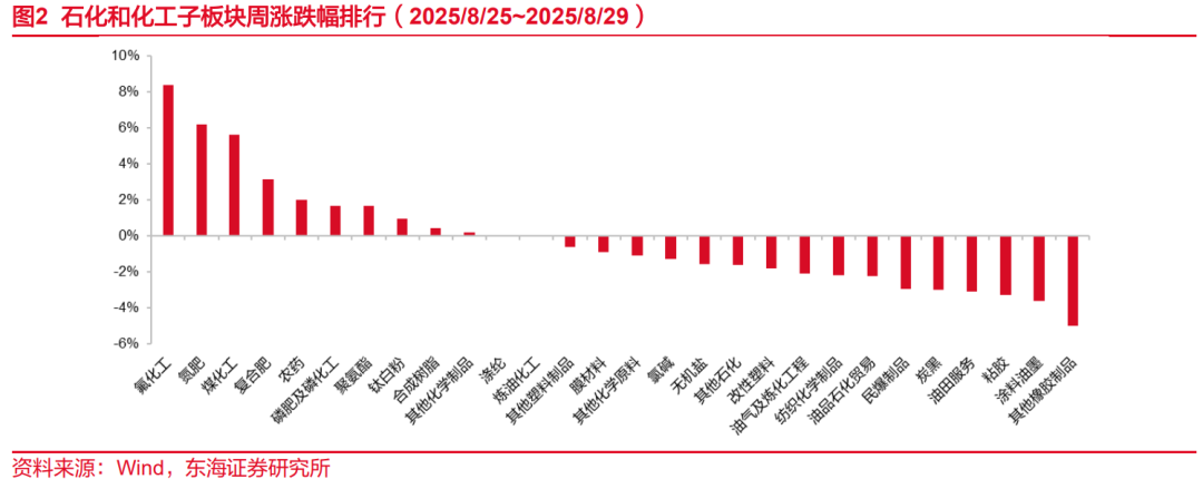行业基础数据跟踪:上周(2025/8/25~2025/8/29),沪深300指数上涨2.71%,申万石油石化指数下跌0.57%,跑输大盘3.28pct,申万基础化工指数上涨1.11%,跑输大盘1.60pct,涨幅在全部申万一级行业中分别位列第20位、第11位。子板块涨跌幅,涨幅前五的为:氟化工:8.35%;氮肥:6.17%;煤化工:5.59%;复合肥:3.14%;农药:2.01%。跌幅前五的为:其他橡胶制品:-5.00%;涂料油墨:-3.64%;粘胶:-3.28%;油田服务:-3.11%;炭黑:-2.99%。