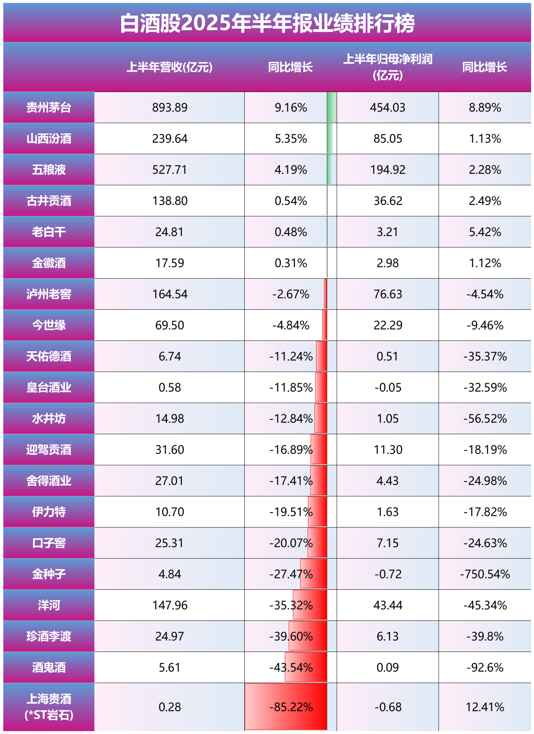 暴跌:金种子(-27.47%)、洋河(-35.32%)、珍酒李渡(-39.60%)、酒鬼酒(-43.54%)、上海贵酒(-85.22%,营收近乎 “腰斩再腰斩”)。