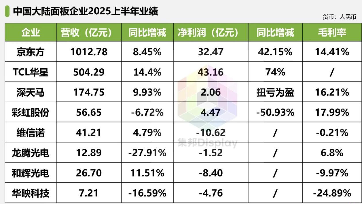 从已披露的上半年财务数据来看,京东方以1012.78亿元的营收和32.47亿元的净利润稳居行业首位,营收同比增长8.45%,净利润大幅增长42.15%,毛利率维持在14.41%的健康水平。TCL华星虽营收规模约为京东方的一半,但其净利润高达43.16亿元,同比激增74%,显示出较强盈利弹性。