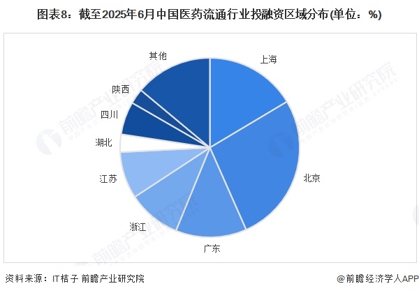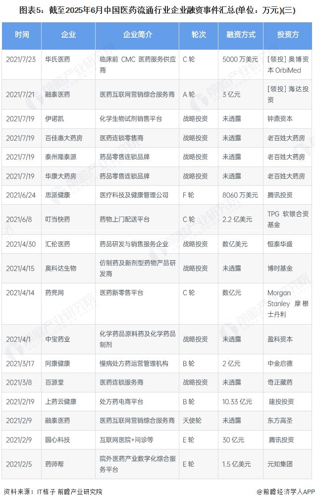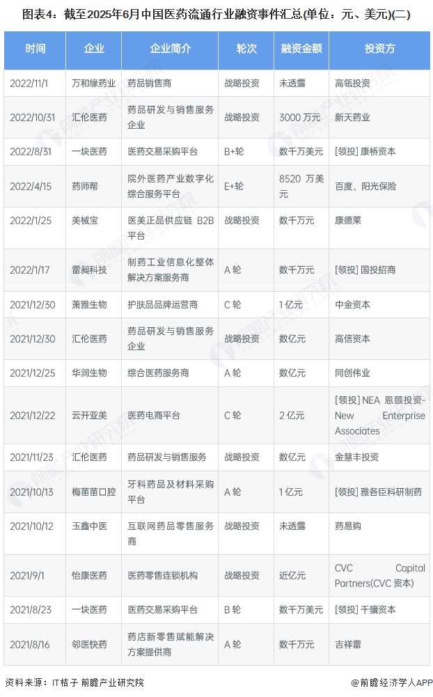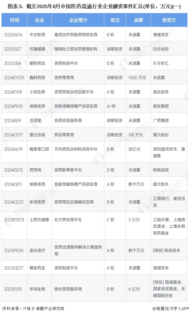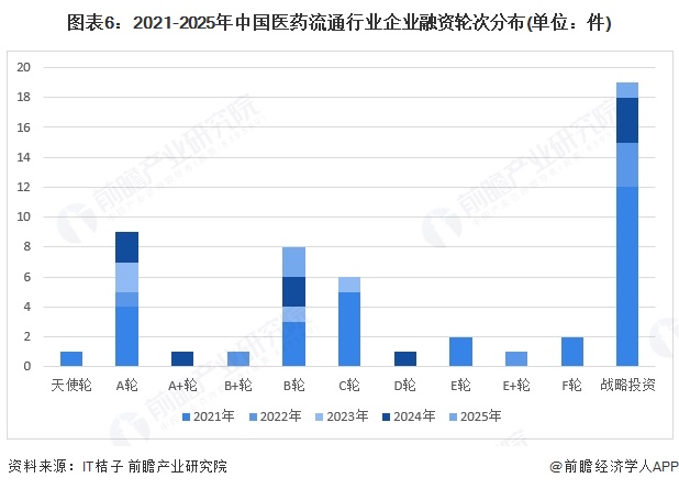 根据企业融资轮次来看,目前行业内主要是战略融资,2021-2025年占比37%,主要原因是企业加速业务转型,通过整合区域网络,规模效应与议价能力得到提升。其次是A轮,占比17.7%,此外,B轮和C轮融资较多。从这些投资轮次来看,体现出医药流通行业商业模式逐步走向成熟,项目风险逐步降低,融资需求更加稳定的特征。