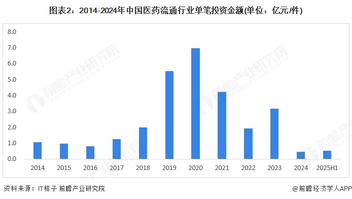 从单笔投资金额来看,2014-2020年单笔投资金额波动上升,从1.1亿元/件上升至7亿元/件,2021年开始单笔投资金额波动下降,2023年再次回升至3.2亿元/件。2024-2025年投资金额为千万元级别。