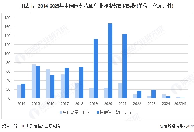 2014-2024年医药流通行业投资规模先增后降,投资数量最活跃的阶段是2014-2017年,金额最高的是2019-2021年,2022年开始投资数量和金额双降。2024年投资数量为9件,投资金额为4.2亿元。截至2025年6月,投资金额为1.6亿元,投资数量为3件。