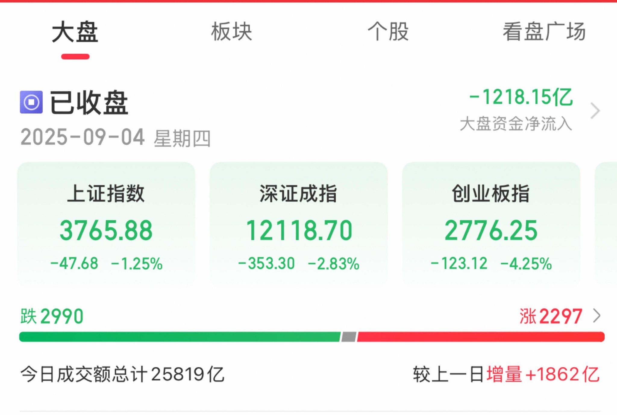 A股今日集体下跌,截至收盘,上证指数跌1.25%,深证成指跌2.83%,创业板跌4.25%,北证50跌0.8%。沪深京三市全天成交额25819亿元,较上日放量1862亿元。全市场近3000只个股下跌。