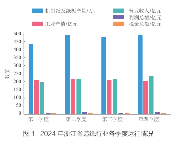 整体看,除第一季度外,后续3个季度产量均稳定在475万t以上高位,显示出较强的生产韧性,表明浙江省造纸行业生产规模持续扩大,市场需求保持较高水平。浙江省2024年全年工业总产值844.3亿元(见图1),同比略降0.4%,反映出需进一步优化产品结构,提高产品附加值;营业收入逐季攀升,从第一季度的201.1亿元持续增长至第四季度的234.7亿元(全年最高),全年累计869.0亿元,同比增长2.2%,库存消化或产销衔接效率较高,但增幅相对有限,需加强市场渗透与品牌建设;利润总额为45.3亿元,同比下降2.2%,显示成本控制压力依然存在,行业竞争激烈;税金总额35.3亿元,同比增长12.4%,税收贡献显著上升,反映出部分企业盈利结构相对健康。