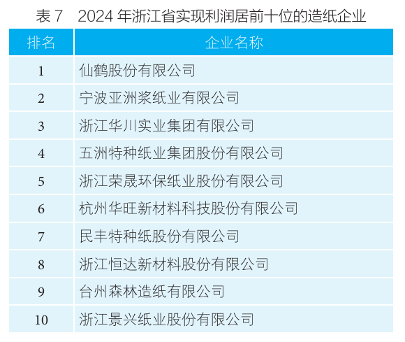 2024年,浙江省实现利润居前十位的造纸企业合计实现利润37.16亿元,占全省行业实现利润总额的82.04%(见表7)。头部企业无论在产量、产值、利润、税收等方面都占据全省的主要份额,中小企业仍需在细分市场中做精、做强上下功夫。