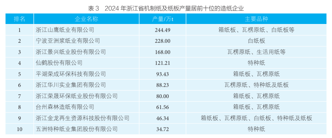 2024年浙江省机制纸及纸板产量居前十位的造纸企业合计生产机制纸及纸板产量1165.98万t,占全省总产量的62.14%(见表3)。