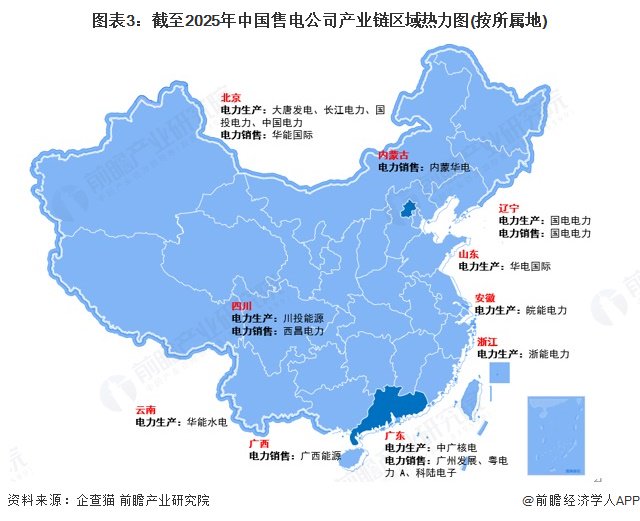 售电公司产业链区域热力地图:集中在东部沿海及南方省份从中国售电公司产业链企业区域分布情况来看,东部沿海及南方省份分布密集,如广东有中广核电、广州发展、粤电力A、科陆电子,浙江有浙能电力,安徽有皖能电力,这些地区经济活跃、电力需求旺盛,企业多深耕本地市场并辐射周边。
