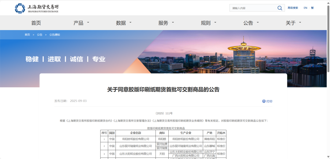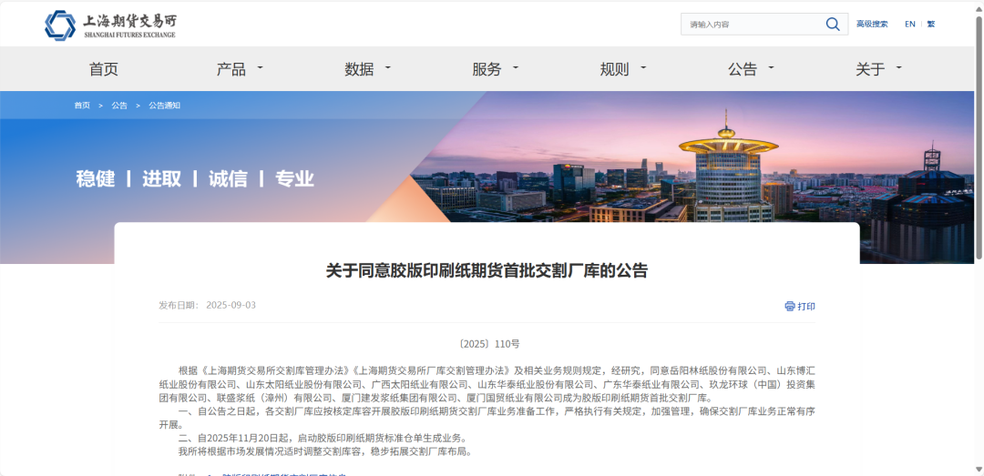 9月3日,上海期货交易所发布《关于同意胶版印刷纸期货首批交割厂库的公告》(〔2025〕110号)及《关于同意胶版印刷纸期货首批可交割商品的公告》(〔2025〕111号)。