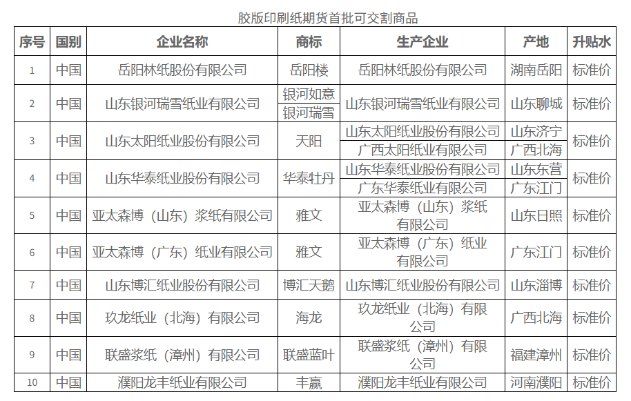 根据《上海期货交易所交割库管理办法》《上海期货交易所厂库交割管理办法》及相关业务规则规定,经研究,同意岳阳林纸股份有限公司、山东博汇纸业股份有限公司、山东太阳纸业股份有限公司、广西太阳纸业有限公司、山东华泰纸业股份有限公司、广东华泰纸业有限公司、玖龙环球(中国)投资集团有限公司、联盛浆纸(漳州)有限公司、厦门建发浆纸集团有限公司、厦门国贸纸业有限公司成为胶版印刷纸期货首批交割厂库。