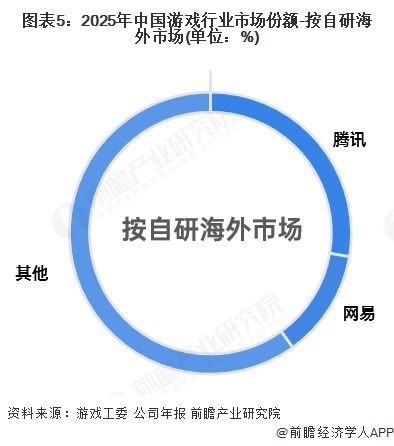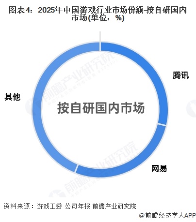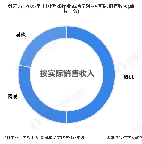 目前,中国游戏行业两大龙头企业分别是腾讯、网易。2025上半年,按实际销售收入来看,腾讯的市场份额达50%,网易的市场份额达28%;按自研国内市场来看,腾讯的市场份额达29%,网易的市场份额达27%;按自研海外市场来看,腾讯、网易的市场份额分为为28%、12%。