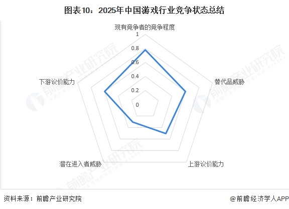 从五力竞争模型角度分析,目前,我国游戏行业属于双寡头主导的行业,腾讯、网易占总市场份额为78%,市场集中度高,且竞争者数量多,竞争状况相当激励;替代品威胁,短视频等新兴文娱产业兴起,可能对游戏产业有所冲击;上游供应商一般为客户端、云端设备、服务器等企业,议价能力适中,而下游消费市场主要是应用商店、App Store、Steam等分发渠道商,占据终端市场,议价能力较弱;同时,因行业存在严格的准入资质以及资金、技术门槛较高,潜在进入者威胁较小。