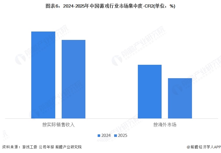 总体来看,我国游戏行业的市场集中度在国内实际销售收入较高,而在海外市场相对偏低,2025年,按实际销售收入划分,中国游戏行业市场集中度-CR2高达78%以上,而按海外市场划分仅为40%,主要是因为国内游戏市场已进入存量竞争市场,头部企业用户粘性强,而海外市场仍为移动游戏市场蓝海,头部市场占有率相对较低。