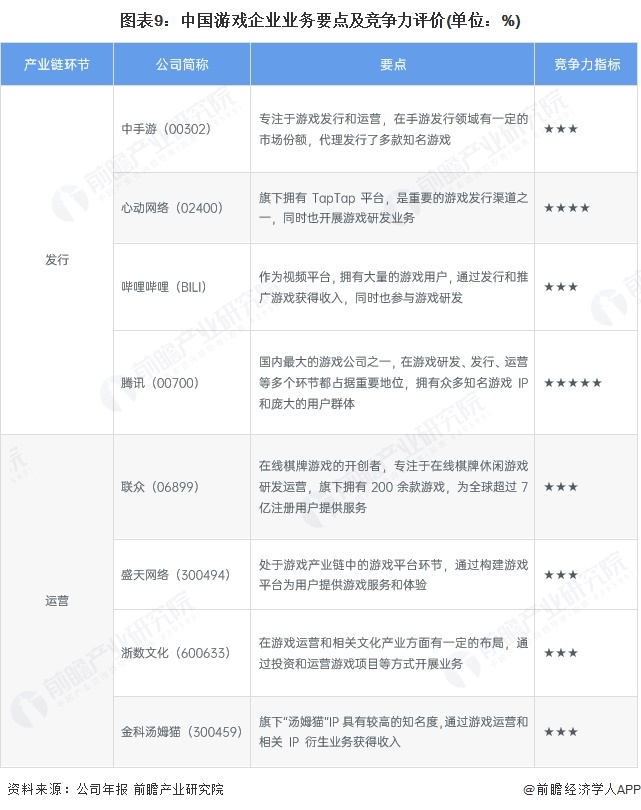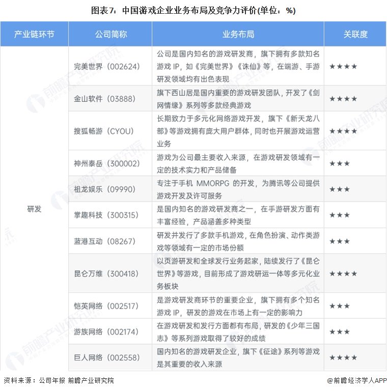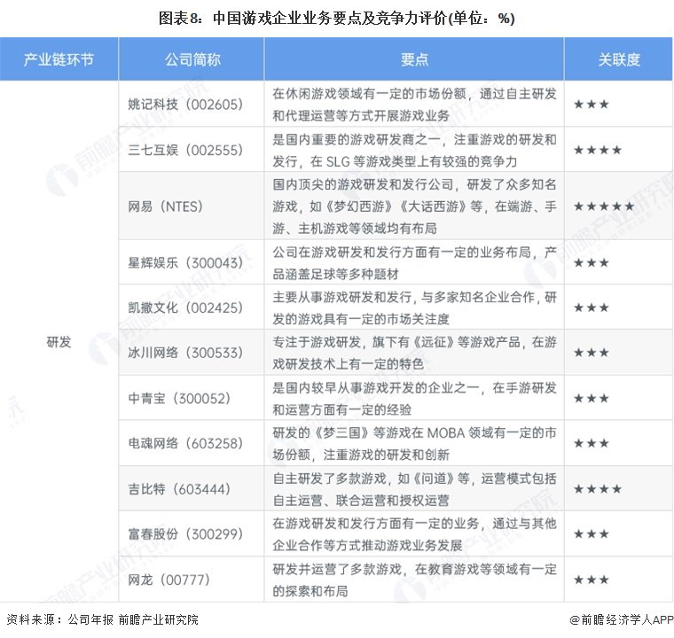 行业主要上市公司:腾讯控股(00700.HK);网易(09999.HK);哔哩哔哩(09626.HK);友谊时光(06820.HK);中手游(00302.HK);ST天润(002113.SZ);惠程科技(002168.SZ);游族网络(002174.SZ);天娱数科(002354.SZ);凯撒文化(002425.SZ);恺英网络(002517.SZ);三七互娱(002555.SZ);巨人网络(002558.SZ);世纪华通(002602.SZ);完美世界(002624.SZ);宝通科技(300031.SZ);星辉娱乐(300043.SZ);三五互联(300051.SZ);中青宝(300052.SZ);顺网科技(300113.SZ);富春股份(300299.SZ);掌趣科技(300315.SZ);昆仑万维(300418.SZ);汤姆猫(300459.SZ);迅游科技(300467.SZ);盛天网络(300494.SZ);盛讯达(300518.SZ);冰川网络(300533.SZ);大晟文化(600892.SH);电魂网络(603258.SH);吉比特(603444.SH);中科云网(002306.SZ);鼎龙文化(002502.SZ);姚记科技(002605.SZ);神州泰岳(300002.SZ);天舟文化(300148.SZ);浙数文化(600633.SH);文投控股(600715.SH);ST瀚叶(600226.SH)。