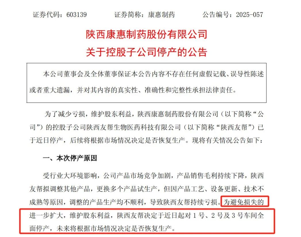 9月4日晚,陕西康惠制药股份有限公司(下称“康惠制药”)发布公告称,为了减少亏损,维护股东利益,公司控股子公司陕西友帮生物医药科技有限公司(下称“陕西友帮”)已于近日停产(1号、2号及3号车间全面停产),后续将根据市场情况决定是否恢复生产。