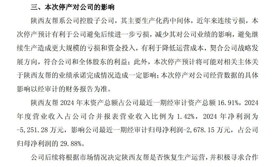康惠制药表示,本次停产预计有利于公司避免后续进一步亏损,减少其对公司业绩的影响,避免继续生产造成更大规模的亏损和资金投入,有利于降低运营成本;此外,本次停产预计将可能对相关主体关于陕西友帮的业绩承诺完成情况造成一定影响;本次停产对公司经营数据的具体影响以经审计的财务报告为准。