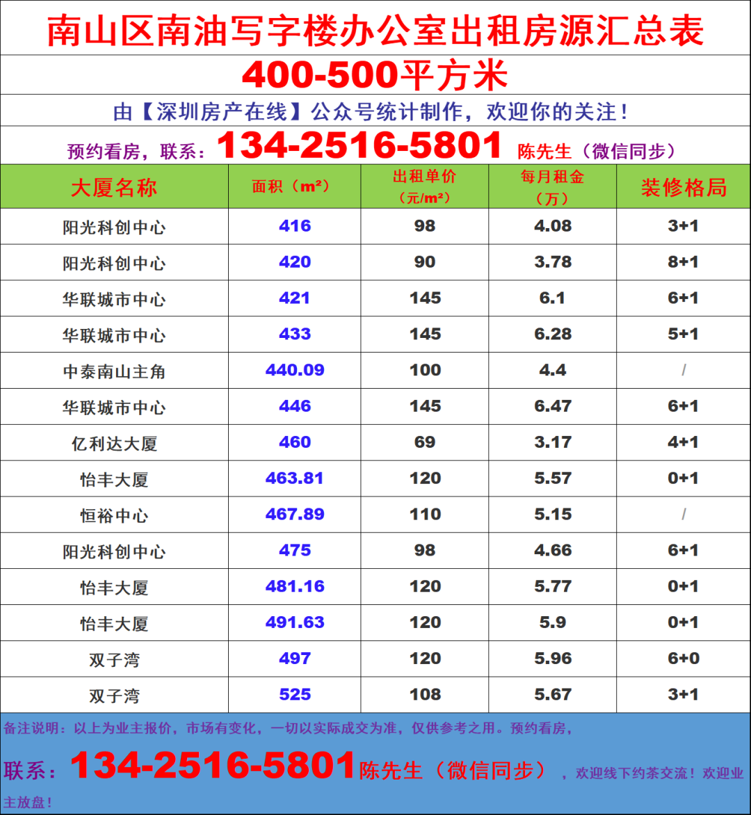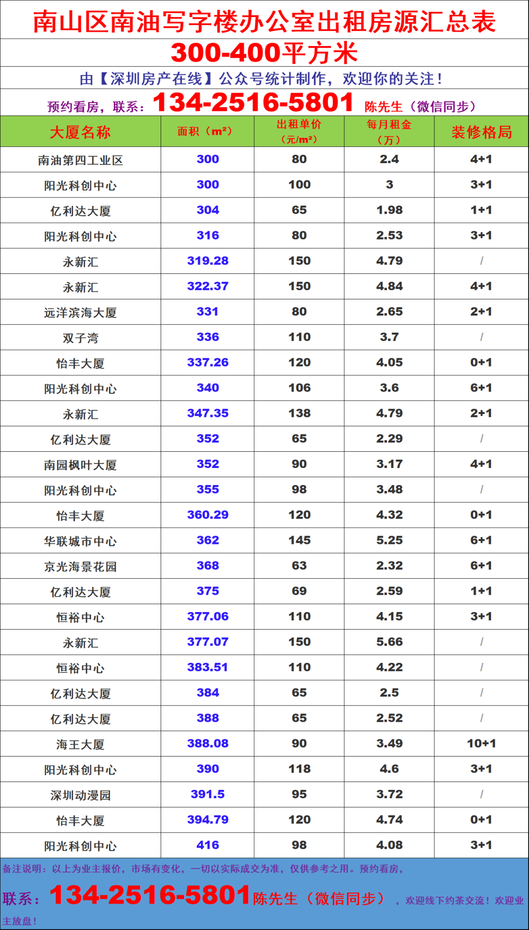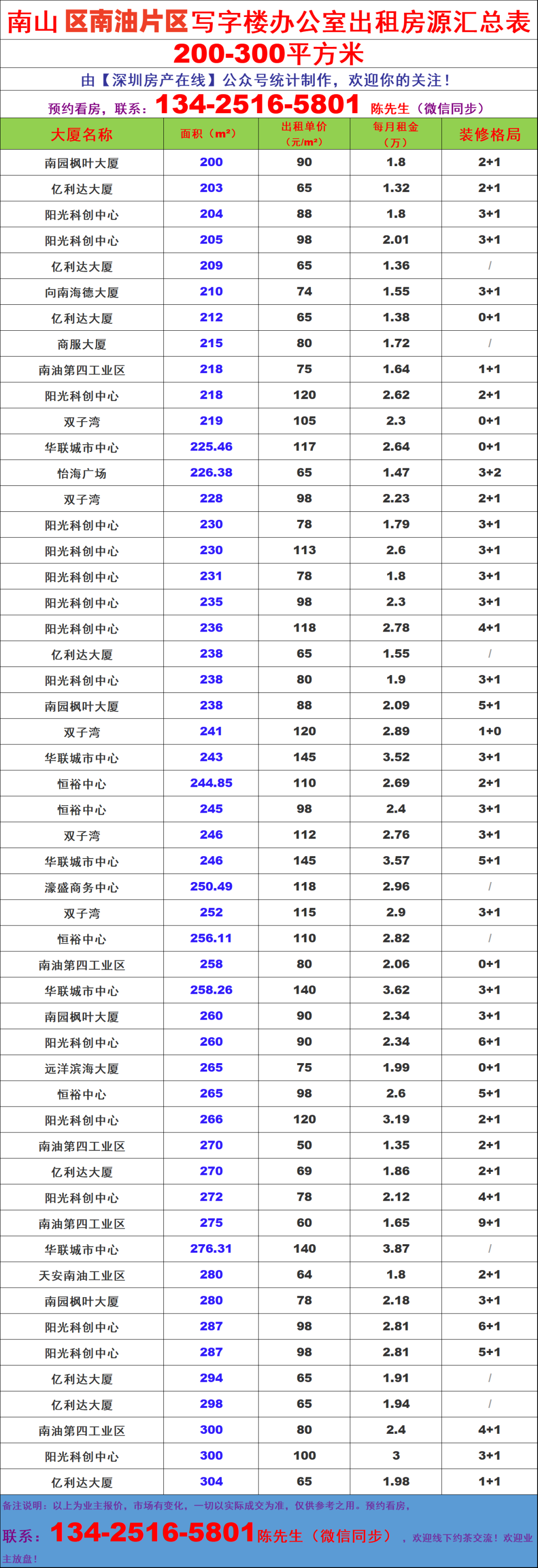 南山区南油写字楼办公室出租房源信息表&租金价格表