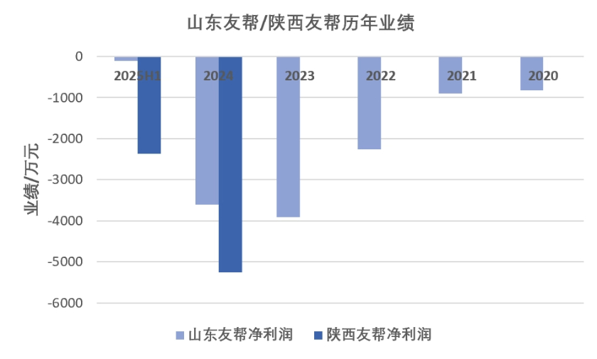 2024年和2025年上半年,陕西友帮营收分别为795.57万元、1829.80万元,占合并报表比例分别为1.42%、7.39%,净利润分别亏损5251.28万元、2366.84万元。2024年影响上市公司归母净利润-2678.15万元,占比29.88%。2025年上半年期末,其净资产-1.16亿元。