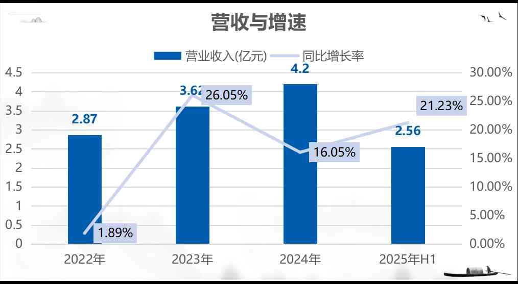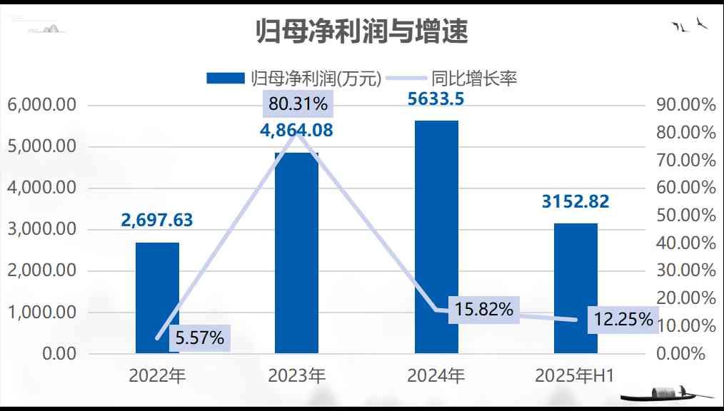 业绩方面,2022-2024年公司营收分别为2.87亿元、3.62亿元、4.2亿元,CAGR达20.97%;2025年H1,公司营收为2.56亿元,与上年同期相比增长21.23%。从归母净利润来看,公司归母净利润从2022年的2697.63万元增长至2024年的5633.5万元,CAGR为44.51%;2025年H1,公司归母净利润为3152.82万元,与上年同期相比增长12.25%。
