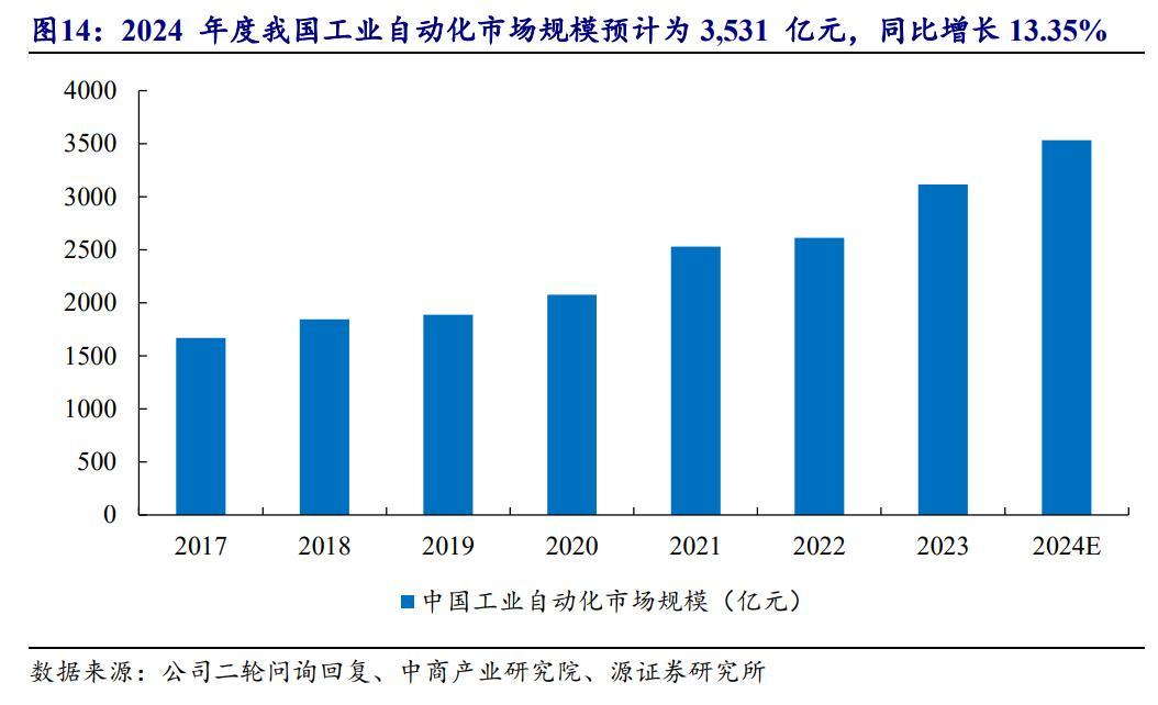 根据中商产业研究院数据显示,2022年度及2023年度我国工业自动化市场规模达2,611亿元及3,115亿元,分别同比增长3.2%及19.30%。2024年度我国工业自动化市场规模预计为3,531亿元,同比增长13.35%。