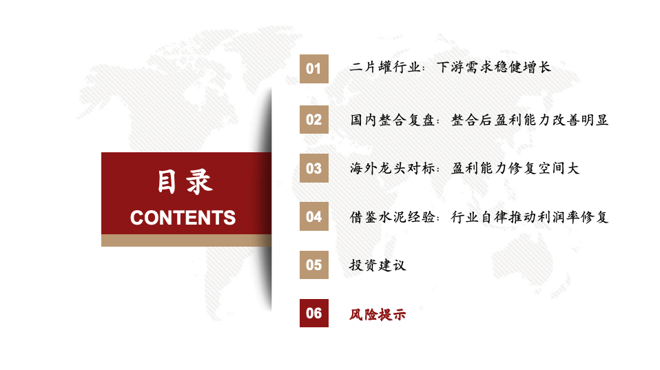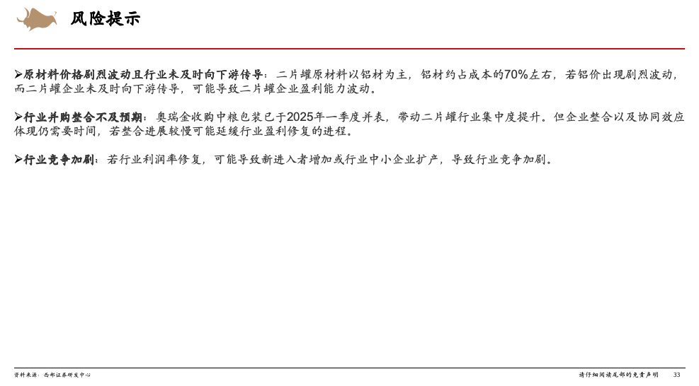 风险提示:原材料价格剧烈波动且无法及时向下游传导风险、行业整合不及预期风险、行业竞争加剧风险等。