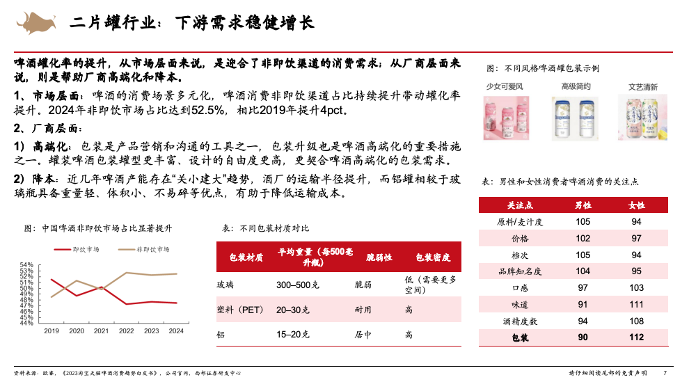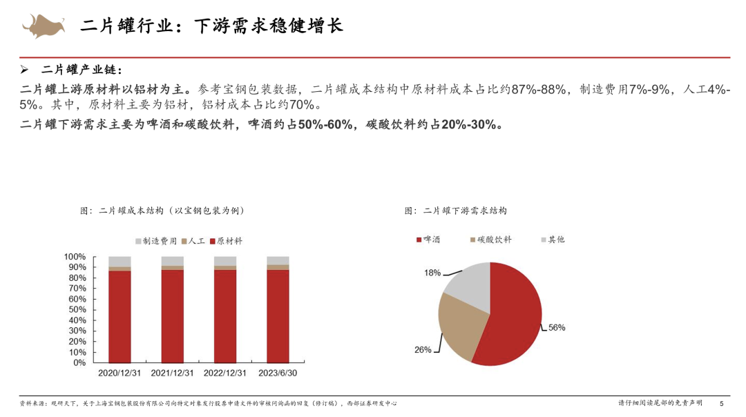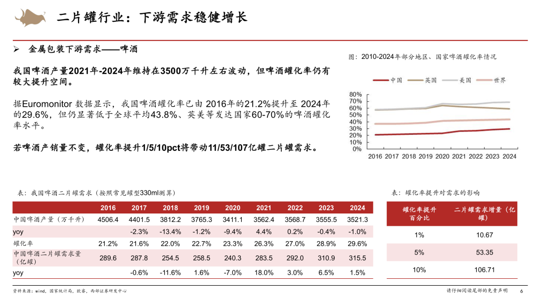金属包装二片罐行业是一个下游需求稳健增长、现金流稳定的行业。二片罐属于金属包装的一种,上游原材料主要为铝材(约占成本的70%);下游需求以啤酒(约占50%-60%)、碳酸饮料(约占20%-30%)为主。我国啤酒二片罐需求量19-24年CAGR约 4%,主要是罐化率提升带动增长,我国啤酒罐化率已由 16年的21.2%提升至 24年的29.6%,但仍显著低于全球平均43.8%、英美等发达国家60-70%的水平,未来啤酒非即饮市场占比提升、产品高端化有望持续推动罐化率提升。