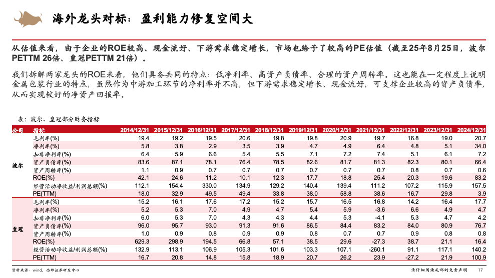 【核心观点】二片罐行业25Q1整合落地、竞争格局优化。当前行业盈利处于历史底部,毛利率小个位数,对比海外龙头波尔、皇冠毛利率20%以及国内盈利高点19年毛利率10%以上,未来盈利修复空间大,而且我们认为行业下游是必需品,且属现金流业务,理应采用DCF折现估值。相关标的:奥瑞金、宝钢包装等。