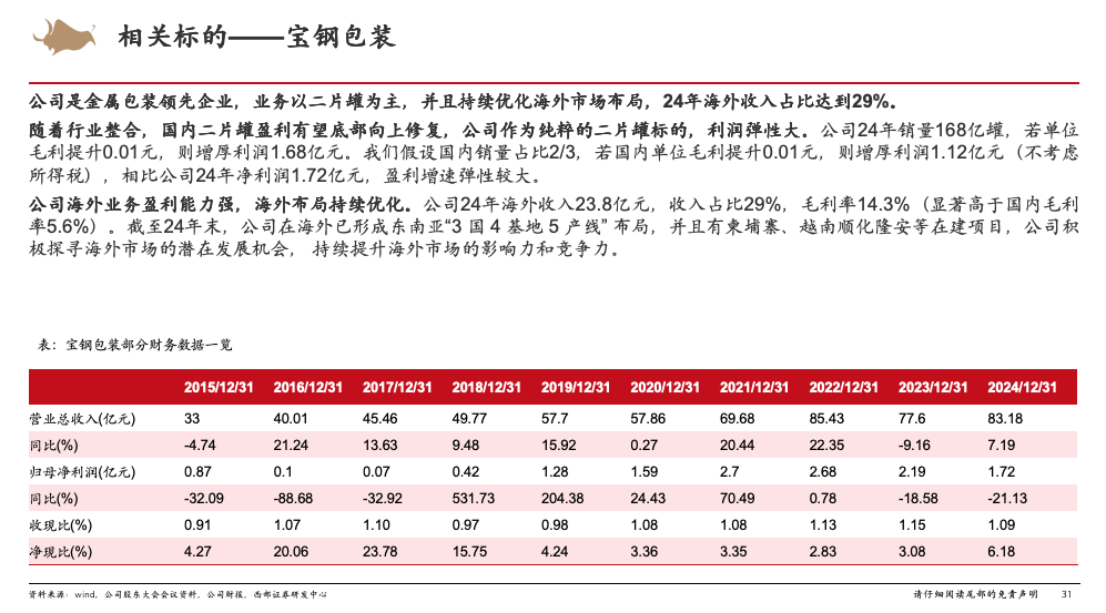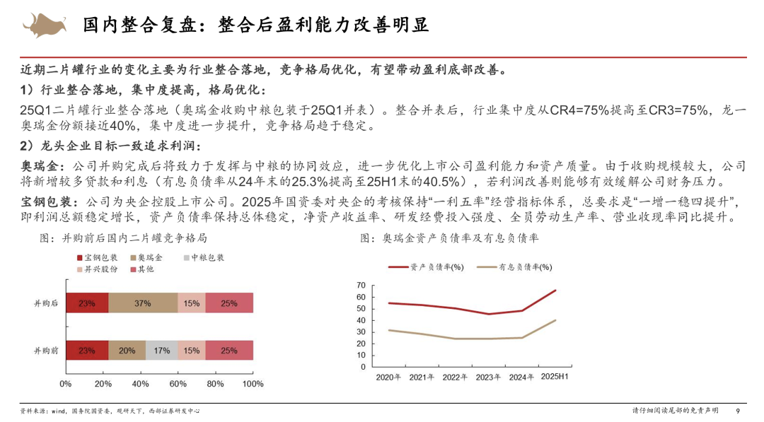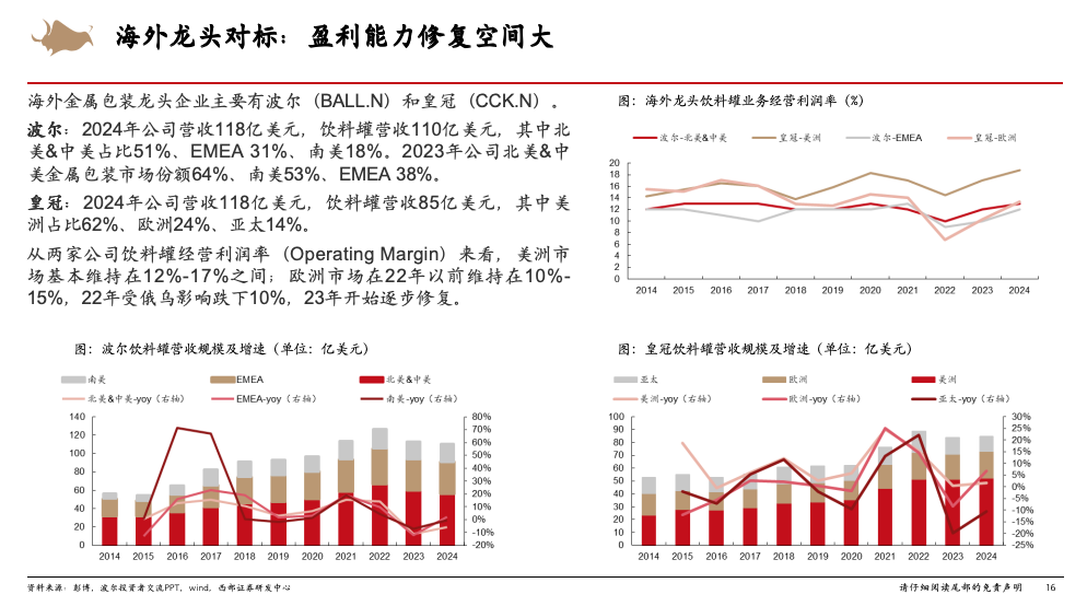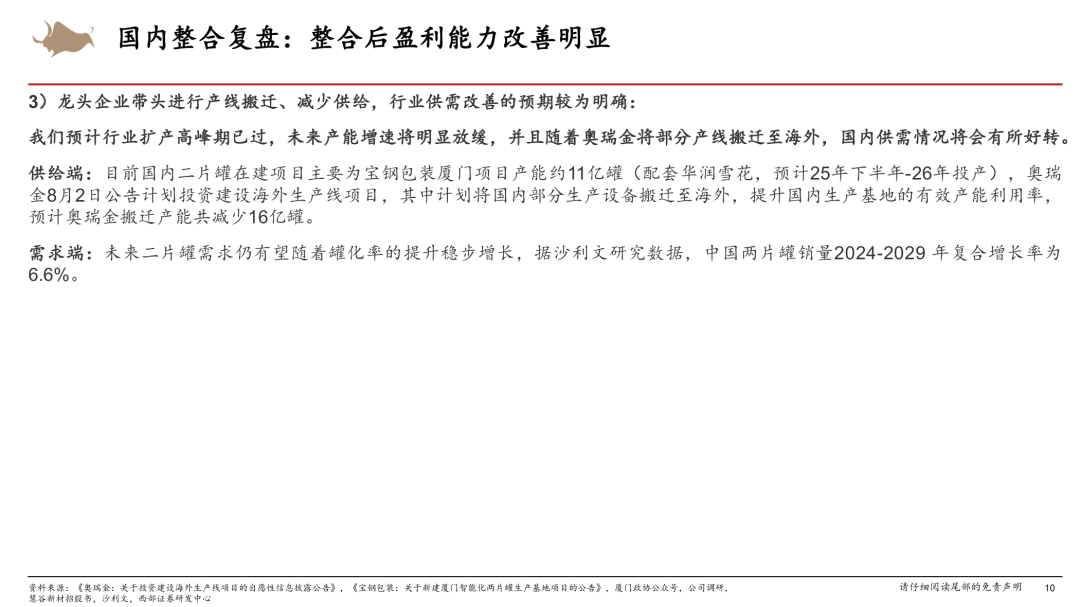 25Q1行业处于盈利底部,行业整合落地、竞争格局优化有望带动盈利逐步修复。25年1月,奥瑞金并购中粮落地,行业集中度从CR4=75%提高至CR3=75%,龙头奥瑞金收购中粮后份额接近40%。并购落地后头部企业目标一致以利润为经营导向,并计划搬迁部分国内产线至海外,行业扩产高峰期基本结束,未来几年国内供需有望持续好转,带动盈利逐步改善。