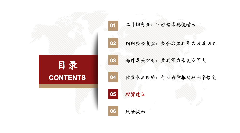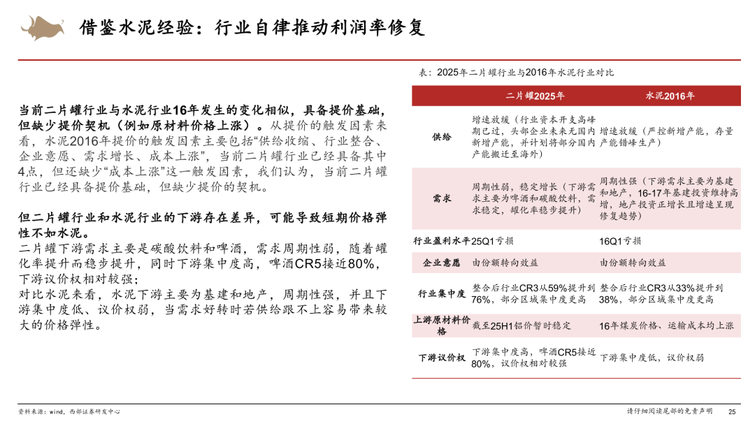 参考水泥行业16-21年的提价周期,我们认为当前二片罐行业与水泥行业16年发生的变化相似,具备提价基础,但缺少提价契机(例如原材料价格上涨)。水泥2016年提价的触发因素主要包括“供给收缩、行业整合、企业意愿、需求增长、成本上涨”,当前二片罐行业已具备其中4点,但还缺少“成本上涨”这一触发因素,后续值得重点跟踪。但二片罐行业和水泥行业的下游存在差异,可能导致短期价格弹性不如水泥。二片罐下游需求周期性弱,随着罐化率提升而稳步提升,同时下游集中度高,啤酒CR5接近80%,下游议价权相对较强;对比水泥来看,水泥下游以基建和地产为主,周期性强,并且下游集中度低、议价权弱,当需求好转时,若供给跟不上,容易带来较大的价格弹性。
