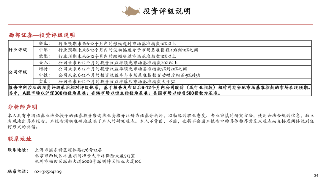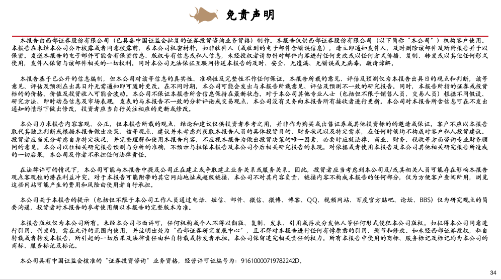 在任何情况下,本公众号所载的观点、结论和建议仅供投资者参考之用,并非作为购买或出售证券或其他投资标的的邀请或保证。客户不应以本公众号取代其独立判断或根据本报告做出决策。该等观点、建议并未考虑到获取本报告人员的具体投资目的、财务状况以及特定需求,在任何时候均不构成对客户私人投资建议。投资者应当充分考虑自身特定状况,并完整理解和使用本公众号内容,不应视本公众号为做出投资决策的唯一因素,必要时应就法律、商业、财务、税收等方面咨询专业财务顾问的意见。西部证券以往相关研究报告预测与分析的准确,不预示与担保本公众号及西部证券今后相关研究报告的表现。对依据或者使用本公众号及西部证券其他相关研究报告所造成的一切后果,西部证券及作者不承担任何法律责任。