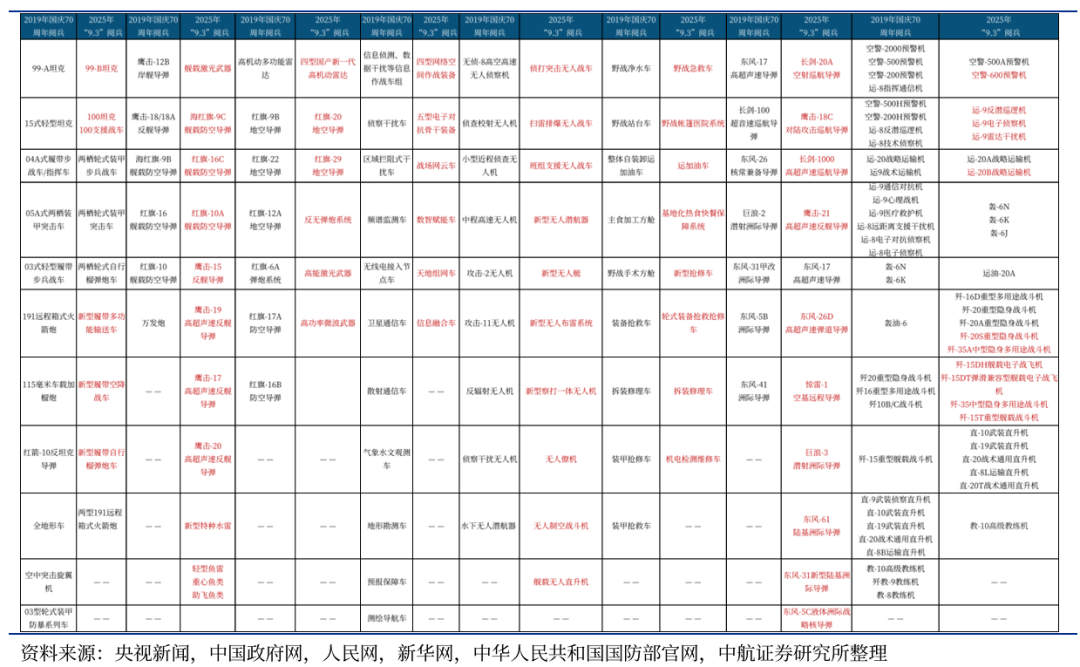 图1 2019年国庆70周年阅兵和2025年“9.3”阅兵受阅武器装备对比(部分)(红色代表首次公开亮相)