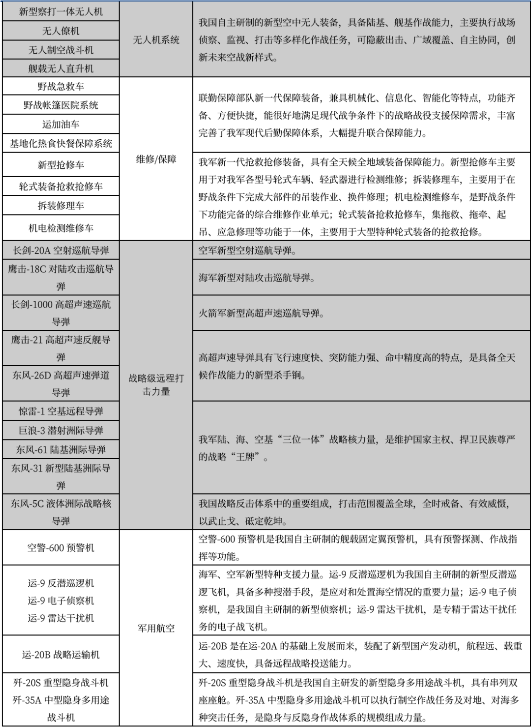 ① 以新型四代装备为主体,例如新型坦克、舰载机、歼击机等,按作战模块进行编组,展示我军体系作战能力。