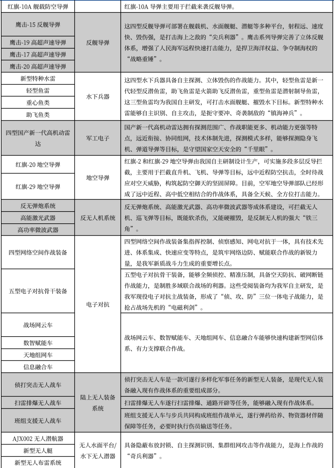 本次阅兵中亮相的装备是继2019年国庆70周年阅兵式后,我军新一代武器装备的集中亮相,特点包括: