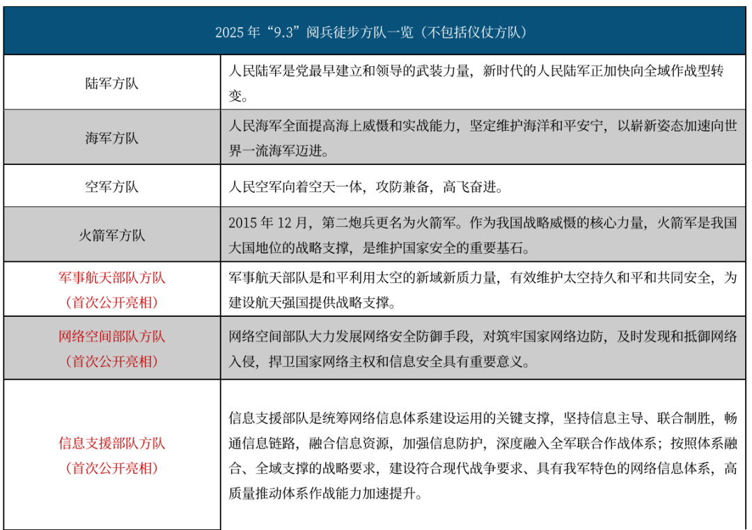 “9.3”阅兵体现了我军“四支军种,四支兵种”的新型军兵种结构布局。本次阅兵共编设了45个方(梯)队,首先接受检阅的是13个徒步方队,在仪仗方队之后,四个军种、四个兵种和武警部队方队首次擎军兵种军旗和武警部队旗集中亮相。其中,除了早已在2019年国庆70周年阅兵式,乃至更早之前的阅兵式中亮相的陆军方队、海军方队、空军方队、火箭军方队四个军种方队,联勤保障部队方队一只兵种方队和武警部队方队以外,军事航天部队方队,网络空间部队方队和信息支援部队方队三支方队首次亮相阅兵场并依次接受检阅,这既是三支兵种的首次亮相,也是我军形成新型军兵种结构布局的证明。