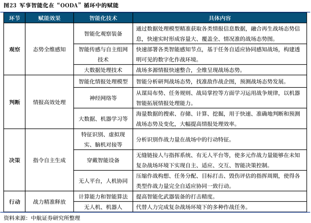军事智能化是信息化的延伸和升级,赋能各作战环节流程(即“OODA环”),从而实现整体作战效果升级。信息化指充分利用现代信息技术开发利用信息资源,促进信息交流和知识共享,推动军事、经济、社会发展转型的历史进程。信息化具有提高军事效能的作用,可通过数字化、网络化、一体化、作战云和数字孪生等实现多种平台跨域联合作战。而智能化则更进一步,在信息互通互融的基础上赋予系统对客观事物进行合理分析,判断及有效地处理、行动的综合能力,是信息化垂直向下的深度融合。以人工智能为例,其三大要素为数据、算法、算力,数据是大数据;算法是机器学习、深度学习、强化学习;算力是超级运算、云计算和未来的量子计算,均需要以充分的信息化为基础。基于技术层面的支撑和应用层面的实现,军事智能化最终形成的作战效果是一个以信息为主导,具备战场感知、信息传输、处理决策、指挥控制、任务执行、效果评估等作战能力的闭环过程。20世纪70年代,美军提出了“OODA”理论,即观察、判断、决策和行动。随着以人工智能为首的新兴技术加速向军事领域转移,智能化赋能“OODA”循环,提高全面性、精准性、一致性,实现作战效果升级。
