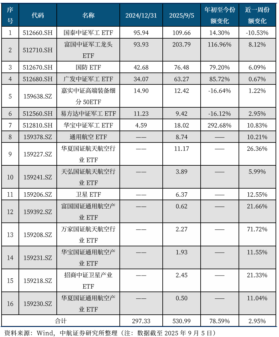 表4 近期军工类ETF基金(含通航、航空航天、卫星等大军工赛道)份额变化(单位:亿份)