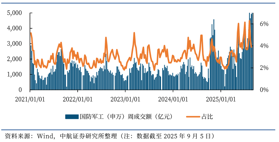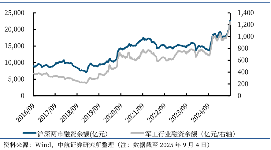 截至2025年8月28日,军工行业的融资余额合计1225.90亿元,比上周环比上涨3.04%,占两市融资余额比例为5.52%。