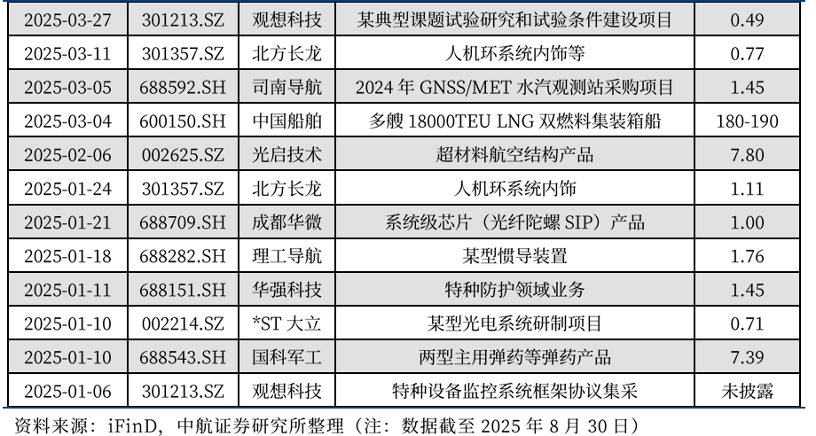 2025年以来,多家航空航天领域中上游上市公司公告了重大合同或中标通知书,具体如下表所示。