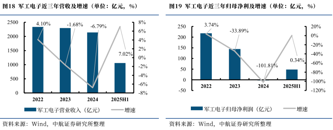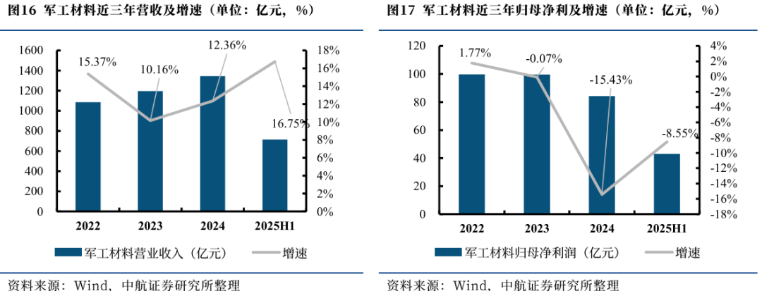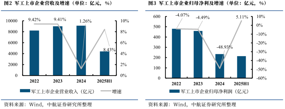 2025年上半年军工上市公司(中航证券军工股票池)共计243家,实现营业收入(4405.48亿元,+8.43%),归母净利润(214.16亿元,+5.11%)。