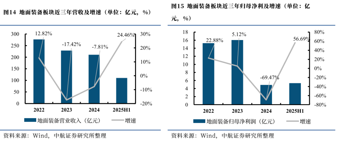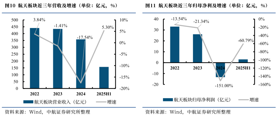 2025年上半年,航空航天相关业务来看,尽管从营收占比较大的主机厂来看,收入利润仍承受了一定的压力,显示出交付结构和下游订单确认的节奏仍处于调整之中,但从上游来看,部分环节业绩已得到一定程度的修复;同时,此前我们强调的大军工逻辑逐渐落地,商业航天、军事智能化等需求为中上游板块带来了一定的新增量,推动了其业绩的触底反弹和修复。