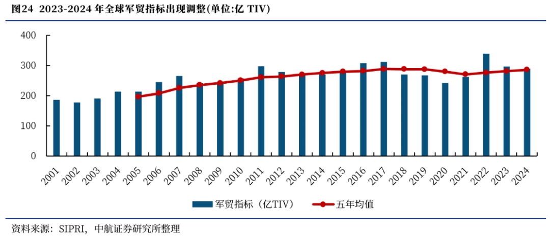 2024年,SIPRI全球军贸指标略有下降,但是军贸热度仍然维持在高位,根据SIPRI数据,单年度看,全球军贸指标在2022年高速增长,创下21世纪以来新高,但由于军贸订单签订与交付存在时间差,以及近年来二手装备占比提升的影响,2023年全球军贸指标同比下降12.37%,2024年再次同比下降2.51%,而2020-2024年军贸指标的五年均值则依旧实现了同比1.56%的增长。基本符合历史上军贸指标存在周期性波动,但整体重心上行趋势不变的特点。