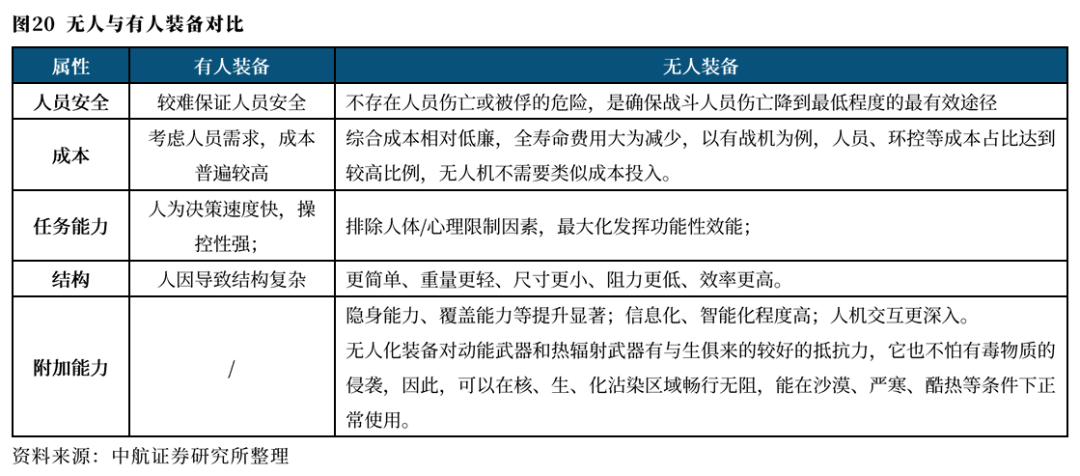 无人化装备区别于有人装备,类似无人化生产,有显著的优越性与劣势。无人化生产相较于有人生产具有安全性、经济性、效率性、耐受性等多重优势。类似的,无人化装备在人员安全、成本、任务能力、附加能力有具备类似显著的优势。