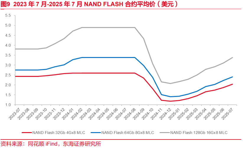 (1)存储芯片价格自2023年下半年以来小幅度反弹,但自2024年9月起,DRAM现货价格略有承压,部分DRAM细分产品价格自2025年2月中旬开始有所回升,波动上涨至6月,其中6月整体涨幅较大,DDR4价格已升至2022年的前期高点,7月起价格顶部震荡。NAND Flash合约价格在大幅下滑后于2025年1月回升,涨势已延续至7月。