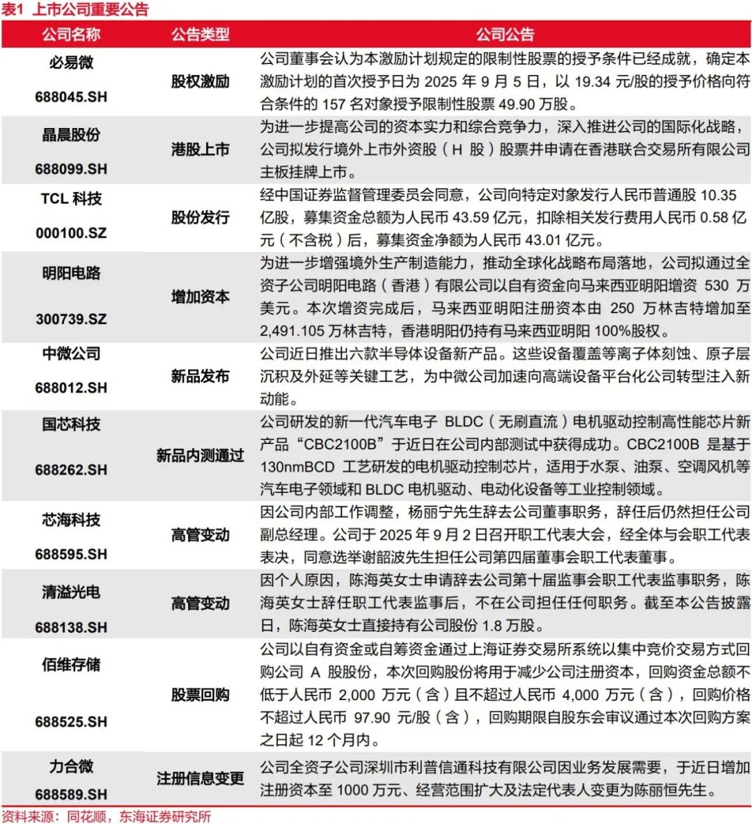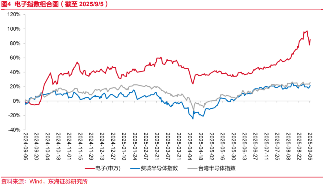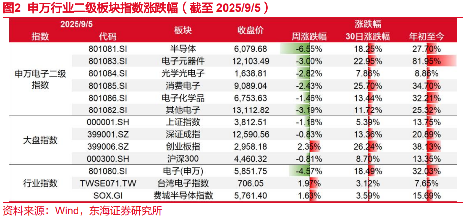 截止9月5日,申万电子二级子板块涨跌:半导体(-6.55%)、电子元器件(-3.00%)、光学光电子(-2.82%)、消费电子(-2.43%)、电子化学品(-1.46%)、其他电子(-3.19%)。海外方面,台湾电子指数上涨1.97%,费城半导体指数上涨1.63%。