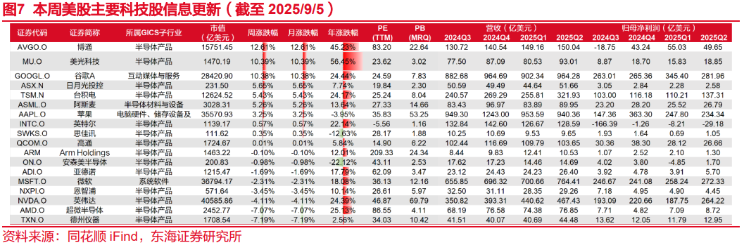 我们选取了较有代表性的部分美股科技股,并将相关信息更新如下。目前美股科技股均发布了二季度财报,同环比大部分取得了上涨。本周涨幅较大的为博通(+12.61%)、美光科技(+10.39%)和谷歌A(+10.38%)。