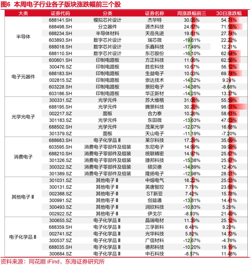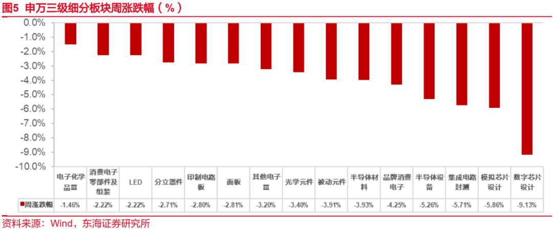 本周半导体细分板块涨跌幅分别为:电子化学品Ⅲ(-1.46%)、消费电子零部件及组装(-2.22%)、LED(-2.22%)、分立器件(-2.71%)、印制电路板(-2.80%)、面板(-2.81%)、其他电子Ⅲ(-3.20%)、光学元件(-3.40%)、被动元件(-3.91%)、半导体材料(-3.93%)、品牌消费电子(-4.25%)、半导体设备(-5.26%)、集成电路封测(-5.71%)、模拟芯片设计(-5.86%)、数字芯片设计(-9.13%)。