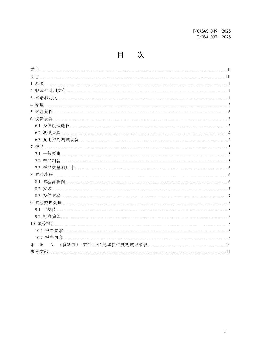 T/CSA 097—2025《光治疗用柔性LED光源 拉伸度测试方法》描述了面向光治疗的柔性可拉伸LED光源拉伸度的测试方法,包括测试原理、仪器和工具、试样准备、试验条件、试验程序、数据结果和试验报告。适用于在可穿戴光治疗仪中柔性可拉伸LED光源的的研发生产、检测分析等,可拉伸的OLED、半导体激光器件等柔性光源可参考使用。