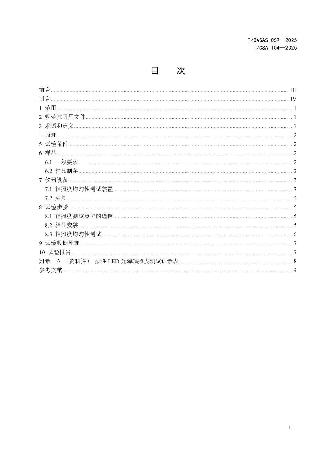 T/CSA 104—2025《光治疗用柔性LED光源 辐照度均匀性测试方法》描述了面向光治疗的柔性、可拉伸LED阵列光源弯曲及拉伸条件下辐照度均匀性测试方法,包括测试原理、试样、仪器和设备、试验条件、试验步骤、数据处理和试验报告。适用于光源在平面、弯曲、拉伸等物理状态下光接收面的光辐照度均匀性测试,其他光医疗光源的光照均匀性测试方法可根据适用性参照执行。