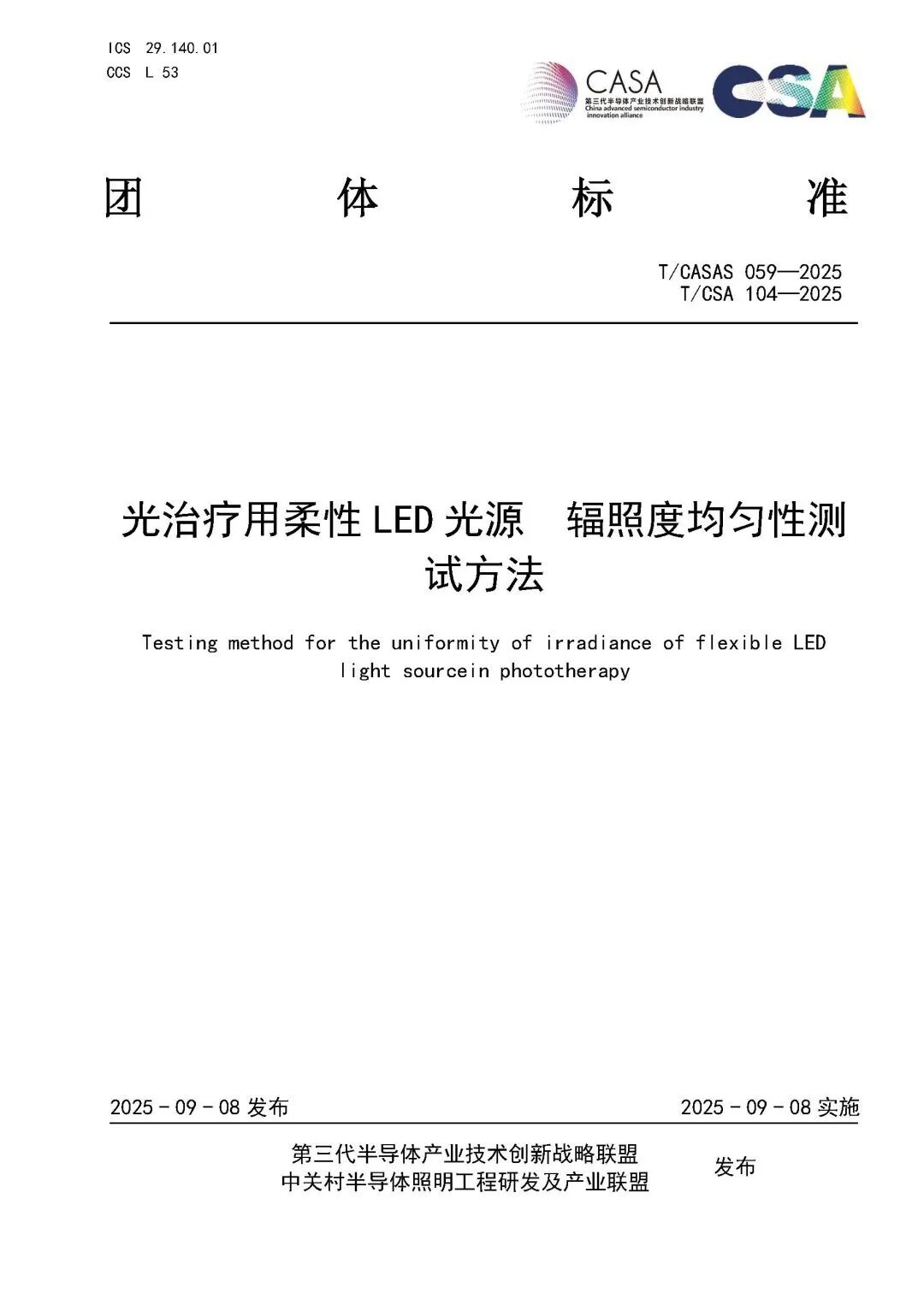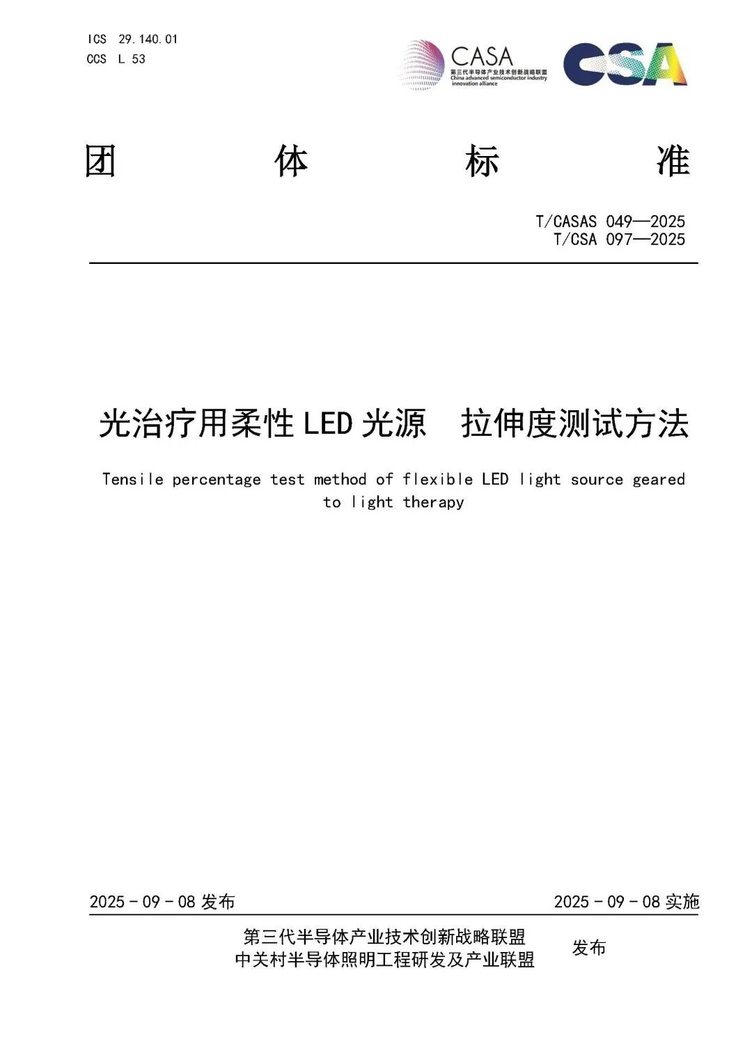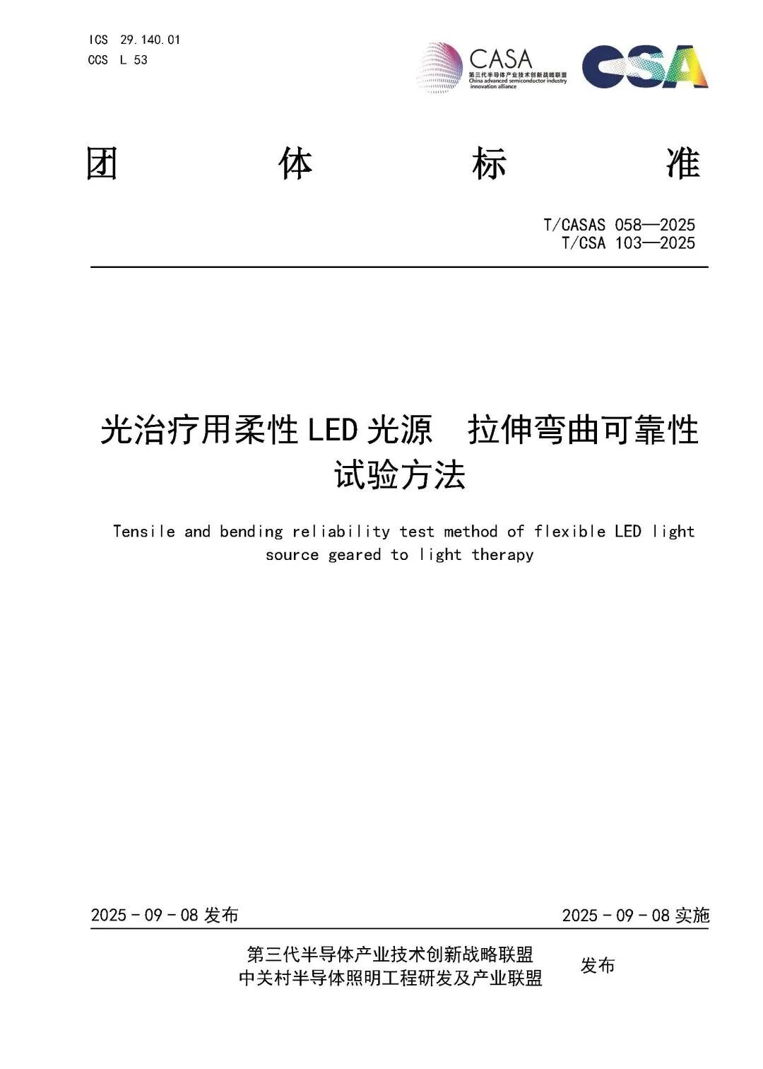 由中国科学院长春光学精密机械与物理研究所牵头制定,遵循 CSAS &CASAS标准制定流程,经过标准起草小组会议讨论、广泛征求意见、委员会草案投票等流程,团体标准T/CSA 097(T/CASAS 049)—2025《光治疗用柔性LED光源 拉伸度测试方法》、T/CSA 103(T/CASAS 058)—2025《光治疗用柔性LED光源 拉伸弯曲可靠性试验方法》、T/CSA 104(T/CASAS 059)—2025《光治疗用柔性LED光源 辐照度均匀性测试方法》于2025年9月8日正式面向产业发布,三项标准由中关村半导体照明工程研发及产业联盟(CSA)与第三代半导体产业技术创新战略联盟(CASA)联合制定发布,联盟官网可供下载阅读。
