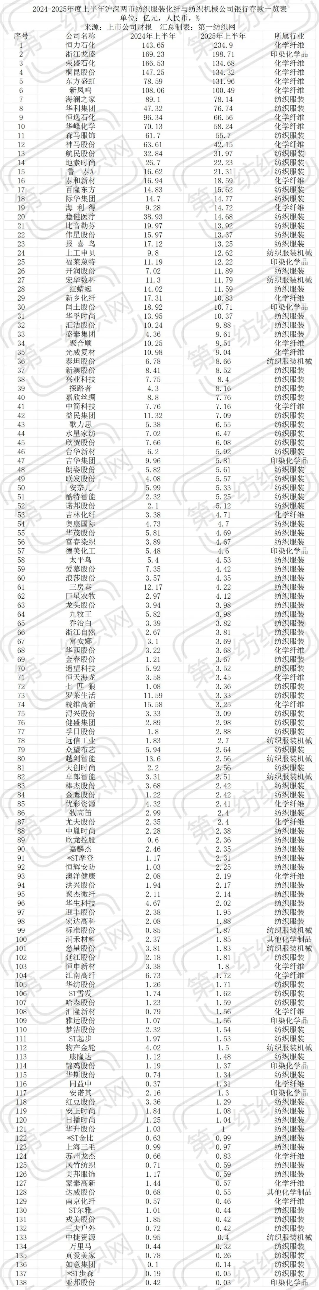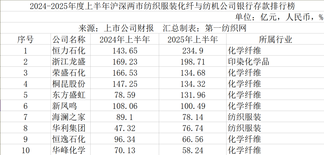 那么沪深两市纺织服装化纤与纺织机械公司的银行存款情况又是怎样的呢?第一纺织网就此进行统计发现,截止2025年6月30日止,138家纺织服装化纤与纺织机械公司的银行存款达1939.79亿元,上年同期为1964.6亿元,其中恒力石化以234.9亿元位居榜首,显示其强劲的现金流管理能力,其次为浙江龙盛,银行存款198.71亿元,第三名为荣盛石化,银行存款134.68亿元。