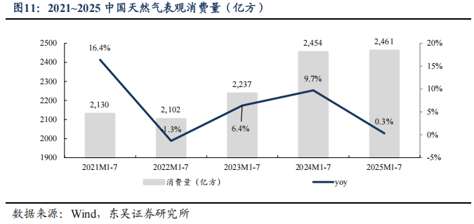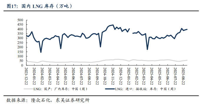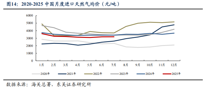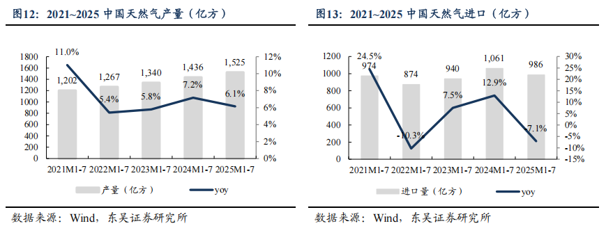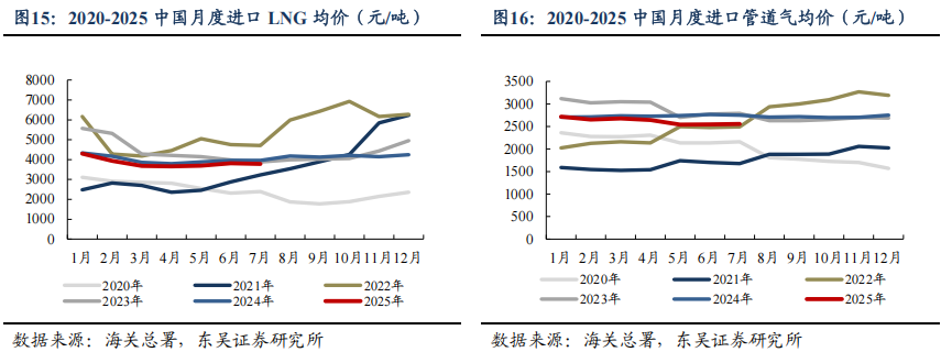 需求恢复缓慢,国内气价周环比-0.5%。2025M1-7,我国天然气表观消费量同比+0.3%至2461亿方,原因或为2024年冬季偏暖,影响了2025M1-3采暖用气需求。2025M1-7,产量同比+6.1%至1525亿方,进口量同比-7.1%至986亿方。2025年7月,国内液态天然气进口均价3787元/吨,环比-0.8%,同比-4.4%;国内气态天然气进口均价2558元/吨,环比+0.5%,同比-7.1%;天然气整体进口均价3189元/吨,环比+0.1%,同比-6.5%。截至2025/09/05,国内进口接收站库存397.22万吨,同比+13.78%,周环比+1.31%;国内LNG厂内库存56.22万吨,同比+59.49%,周环比+5.78%。